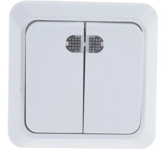 Двухклавишный выключатель с подсветкой, белый UNIVersal Олимп О0123 имеет классическую квадратную форму и белый цвет пластикового корпуса. Изделие легко устанавливается накладным способом. Служит для регулировки освещения многоламповых люстр или двух отдельных помещений, например, раздельного санузла или коридоров.