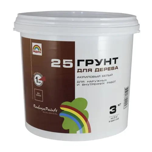 «Радуга» — нетоксичная, без резкого запаха грунтовка, предназначенная для работ по дереву, фанере, древесностружечным плитам и другим материалам на древесной основе. Может использоваться не только внутри, но и снаружи помещений перед нанесением акриловых красок. Глубоко проникает внутрь материала-основы, улучшая адгезию с последующими слоями и повышая их долговечность. При необходимости может колероваться водорастворимыми пигментами.
