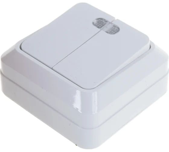 Двухклавишный выключатель с подсветкой, белый UNIVersal Олимп О0123 имеет классическую квадратную форму и белый цвет пластикового корпуса. Изделие легко устанавливается накладным способом. Служит для регулировки освещения многоламповых люстр или двух отдельных помещений, например, раздельного санузла или коридоров.